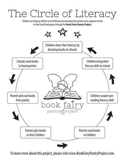 The Book Fairy Pantry Project is a grassroots family literacy movement. This project will be implemented by the people, for the people. Volunteer book fairy helpers will collect new and gently used, quality children’s books from donation boxes and book drives and deliver them to participating food pantries and WIC offices to be given out to parents.