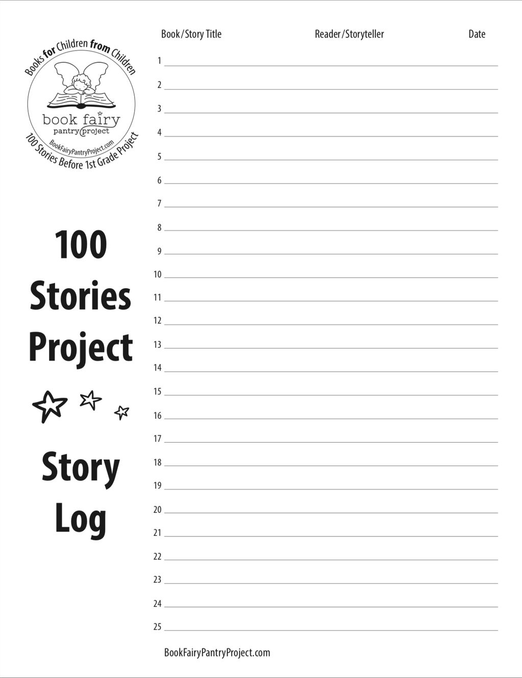 100 Stories Project Story Log. This file is two pages, front and back. Easily printed in black and white and stapled.